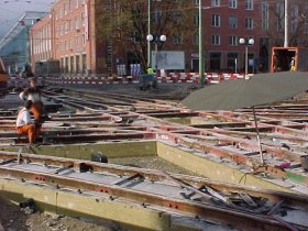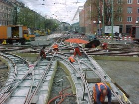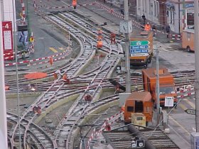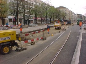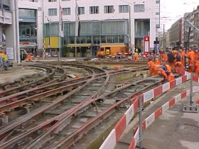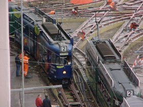 Ein DüWag-15er auf den neuen Geleisen am Messeplatz.