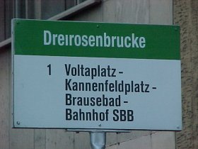Der 1er mit rotem Zielschild an der Dreirosenbrücke.