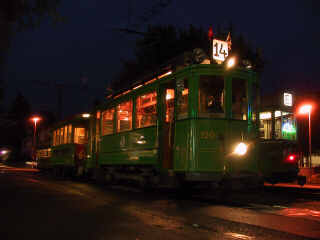 Betriebstag des TCB anlässlich des Jubiläums "80 Jahre Tram nach Pratteln". Dazu verkehrten am Samstagabend verschiedene Oldtimerkompositionen zwischen Aeschenplatz und Pratteln im normalen Fahrplanverkehr. Die Kurse wurden vom Publikum rege benutzt und stiessen auf Begeisterung, vor allem von jungen Leuten kamen viele positive, sympathische und respektvolle Bemerkungen. Eigentlich sollten deshalb solche Linieneinsätze von Oldtimern häufiger durchgeführt werden. Wegen eines Defekts am Frontscheinwerfer musste der Be2/2 190 (mit B3 1303) vorzeitig ins Depot zurückkehren. Um etwa 21 Uhr blieb der Schwerzug mit dem Wagen 163 wegen eines Bremsdefekts des hintersten Anhängers nach der Haltestelle Hardstrasse Richtung Pratteln stehen und führte so zu einem Betriebsunterbruch der Linie 14. Stargast war die lange nicht mehr gesehene Baracke 413, die mit einem B4 verkehrte. Der Publikumsansturm war zeitweise auch wegen eines Fussballmaches so gross, dass die Leute, wie in alten Zeiten, stehen mussten. Glücklicherweise wurde der Wagen nicht solo auf die Strecke geschickt.
