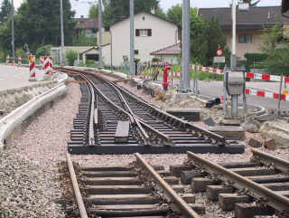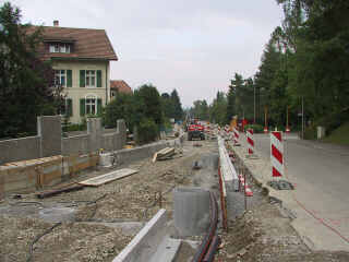 Grund dieser Streckeneinstellung: Zwischen den Haltestellen "Baselstrasse" und "Im Lee" werden die Gleisanlagen und das Trasse völlig neu gebaut. Die Weichen wurden entfernt, und statt der bisherigen Einspurstrecke wird eine Gleisverschlingung erstellt. Bild: Bei der Haltestelle "Baselstrasse" ist das neue Geleise bereits im Entstehen. (H. Ziegler)