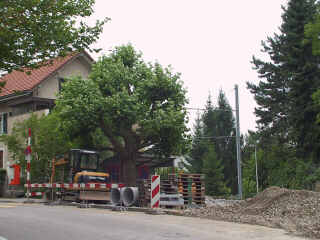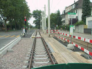 Ab Fr.12/7/02 bis ca.14/10/02 Einspurbetrieb auf dem Gleis Richtung Riehen. Bedienung der Haltestelle Habermatten Richtung Riehen normal auf der neuen Haltestelle. Richtung Stadt befindet sich die Haltestelle provisorisch vor der Haltestelle mit Brettern als Perron.