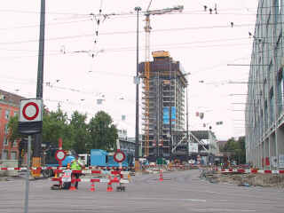 BVB: Während der Messeturm in die Höhe wächst, wird auch im Bereich der ehemaligen Tramhaltestelle tüchtig gearbeitet: Die Tramwartehalle ist weggeräumt und der ganze Platz eine einzige Baustelle. Demnächst sollen auch hier die Geleise bis zum Badischen Bahnhof erneuert werden.