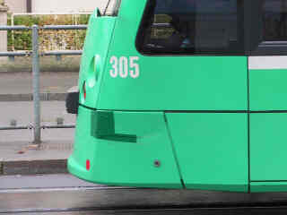 Ein mit dezenten Klebstreifen fachmännsich reparierter Kollisionsschaden beim Combino 305. (PS: Diese dunklen Klebstreifen stammen offensichtlich aus dem Verbandkasten des Oldtimers 215!) (H. Ziegler)