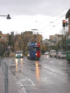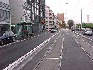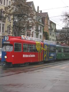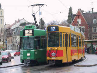 Begegnung zweier Linien am Wettsteinplatz, die sich normalerweise nie begegnen: Die Messe bringt den 17-er sonntags über die Wettsteinbrücke. Einen Düwag auf der Linie 17 habe ich leider nicht gesehen. (H. Ziegler)