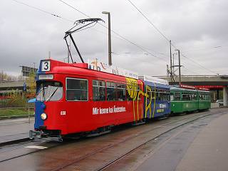 Der FCB-Düwag 638 ist zur Zeit zusammen mit seinem grünen Artgenossen 651 im normalen Kurseinsatz auf Linie 3 zu sehen.